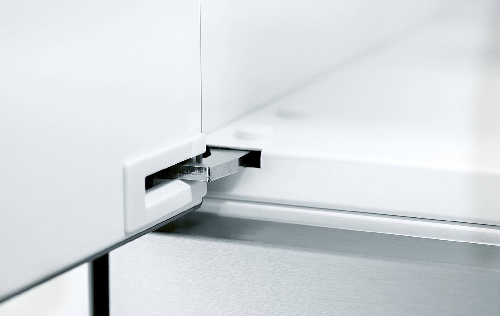 Die Küchen fügen sich harmonisch in die schlichte Innenarchitektur ein. Ins Auge stechen die pulverbeschichteten petrolblauen Fronten, dahinter verbergen sich weitere typische Merkmale: etwa die patentierten Scharniere, die in die Decken und Böden der Schränke eingelassen sind und nicht nachjustiert werden müssen, oder die nur acht Millimeter dünnen Tablare, die für Leichtigkeit und Belastbarkeit zugleich sorgen. Die Fronten und Seiten der Möbel bestehen aus ineinandergreifenden Stahlhüllen, in deren Mitte eine Wabenkonstruktion aus rezykliertem, biologisch abbaubarem Karton für Stabilität sorgt. Auch der Stahl, der 91 Prozent des Küchenmaterials ausmacht, besteht zu einem Drittel aus rezykliertem Stahlschrott. Dadurch lässt sich der Baustoff im Falle eines Rückbaus einer neuen Bestimmung zuführen. Küchen von Forster sind aber auch begehrte Occasionsobjekte: Überholt und neu gespritzt, sind sie im Sinne einer einfachen Kreislaufwirtschaft problemlos ein zweites Mal einsetzbar. Eine schöne Parallele zum Felix-Platter-Spital.