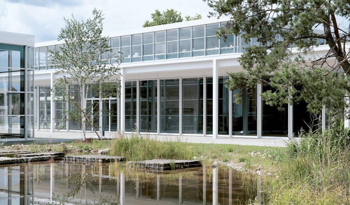 Das Architekturbüro Jessenvollenweider hat als Erweiterung drei niedrigere, pavillonartige Volumen in eine neue Ost-West-Achse gesetzt. Konstruiert wurde es ebenfalls mit einem Stahltragwerk – als Neuinterpretation des Bestandes. Im Unterschied zu den Altbauten liegt hier das Tragwerk aber aussen, und die Stützen sind aus den Ecken gerückt, sodass Alt- und Neubauten trotz der vielen Gemeinsamkeiten deutlich zu unterscheiden sind. Der Stahlbau der Ergänzungsbauten stammt vom Metall- und Fassadenbauunternehmen Krapf AG. Die Primärtragkonstruktion besteht aus lasergeschweissten Stahlprofilen mit Einsatzelementen in Janisol (vom Schweizer Hersteller Jansen). Die festen Elemente, die Schiebetüren, die Doppelflügel-Drehtüren und die gebogenen Eckelemente sind Spezialanfertigungen, denn die bauphysikalischen Anforderungen mit derart filigranen Profilen zu erfüllen, war eine Herausforderung. Besonders der Einbau der beweglichen Elemente und die damit verbundene Entwässerung mussten hohen Ansprüchen genügen. Dafür wurde eigens eine Sockelkonstruktion entwickelt.