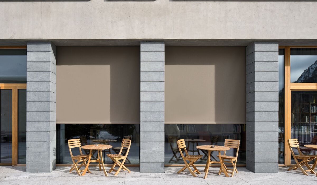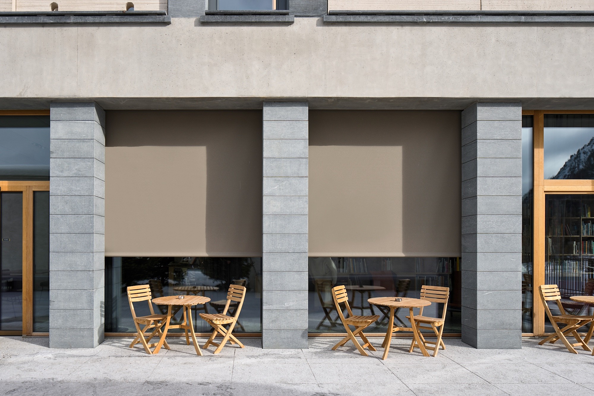 «Sensationell ist das Gebäude, nicht unser Beitrag», sagt Marc Kästli. Im Hauptgebäude haben die Sonnenstoren der Firma Kästli neben dem Verschatten vor allem eine Aufgabe: nicht weiter aufzufallen. Sie sind weder gestreift noch strahlend weiss, sondern umbrafarben (lat. umbra, der Schatten), tragen also die schöne Nichtfarbe des dahinterliegenden Halbdunkels nach vorne. Als Vertikalmarkisen mit Seilführung bleiben sie demütig innerhalb des Gebäudevolumens, bei den Hotelzimmern in den Obergeschossen wie bei den Gesellschaftsräumen im Erdgeschoss. Nur bei den Ferienwohnungen im weissen, talseitig gelegenen Sockel dürfen sie ausscheren. Die Farbe der dortigen Markisen entspricht derjenigen der Putzfassade und trägt den etwas unzeitgemässen Namen «Colonial White». Mit ihrem Fallarm strecken sich die Markisen in Richtung Val Roseg. Da das Energiegesetz dies vorschreibt, haben die sonnenexponierten Loggien zwei Storen hintereinander: eine Vertikalmarkise am Fenster und eine Fallarmmarkise an der Loggiabrüstung.
