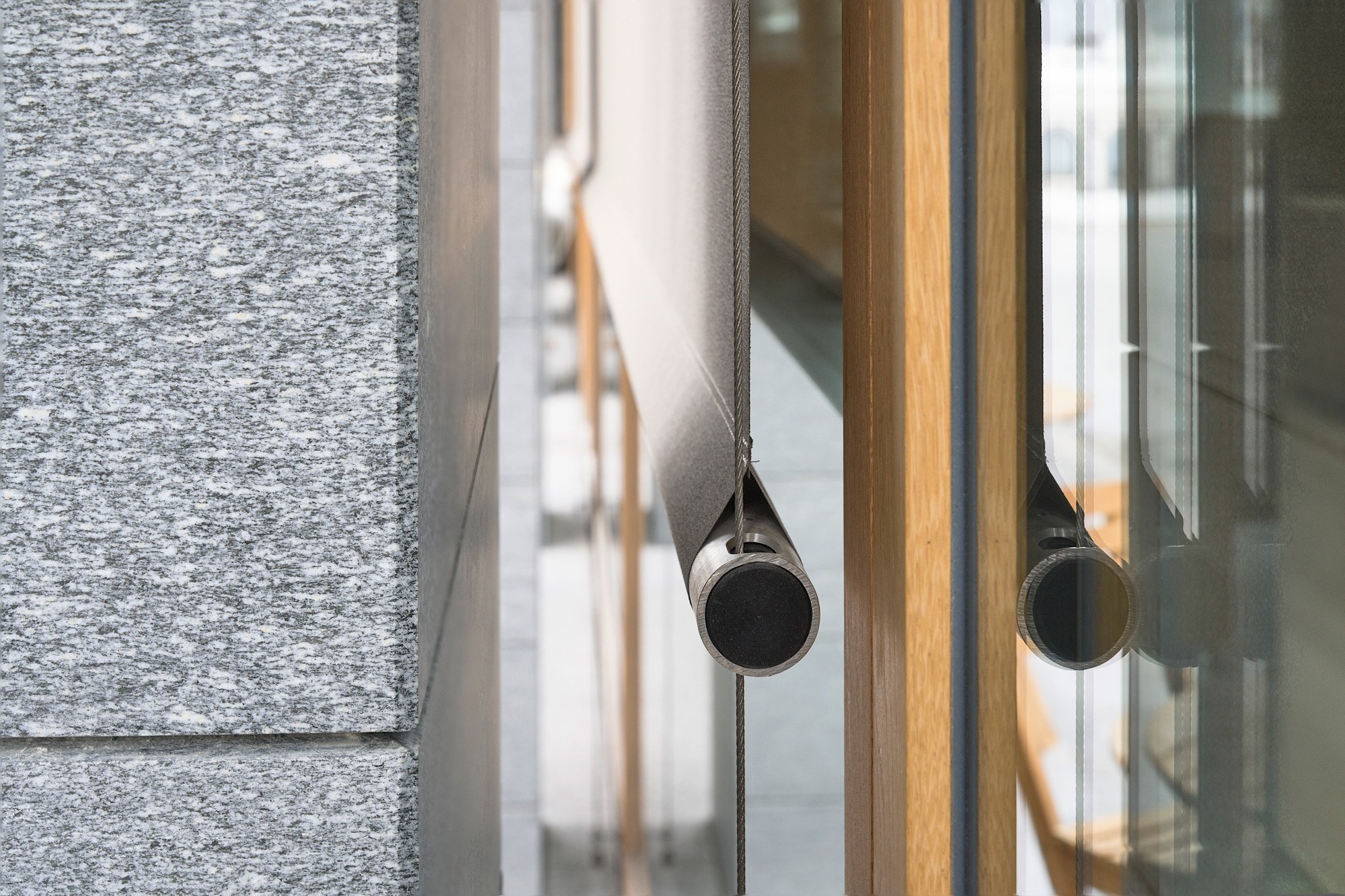 Die Markisen sind von hoher Qualität. Ihr farbechtes Polyestergewebe stammt von der Weberei Sattler aus Graz. Es wirkt haptisch und ist halbtransparent, daher sieht man auch bei geschlossenen Storen, dass die Berge davor noch immer dort stehen. Mit 2,6 Metern sind die Bahnen des Stoffes extra breit, und vertikale Nähte entfallen. Die ausgefrästen Drahtseilführungen an den Enden der Fallstangen aus Chromstahl zeigen, dass es sich nicht um Standardware handelt.