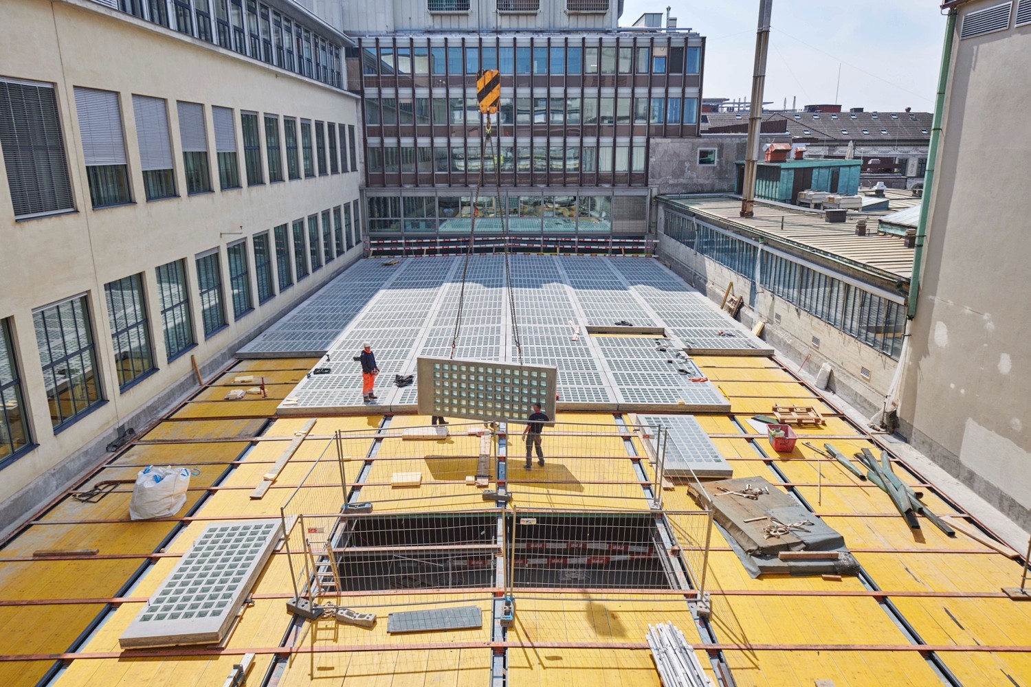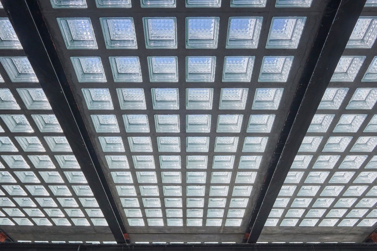168 vorgefertigte Elemente bilden das Dach. Jedes davon besteht aus 65 respektive 78 Doppelblockhohlglasbausteinen, die mit 5 Zentimeter breitem, teilweise dämmendem Beton zusammengegossen wurden und mit Hybridkitt abgedichtet. Dass die Verbindung aus armiertem Beton und Glas Spannungen erzeugt, muss bei der Produktion einberechnen werden. Vorgefertigt hievte ein Kran diese 3.80 auf 1.65 Meter messenden Elemente auf das historische Dachtragwerk aus Stahl, das nicht verstärkt werden musste. Um die Dichtigkeit zu testen, flutete die Feuerwehr das Dach. Diesmal tropfte nichts durch.