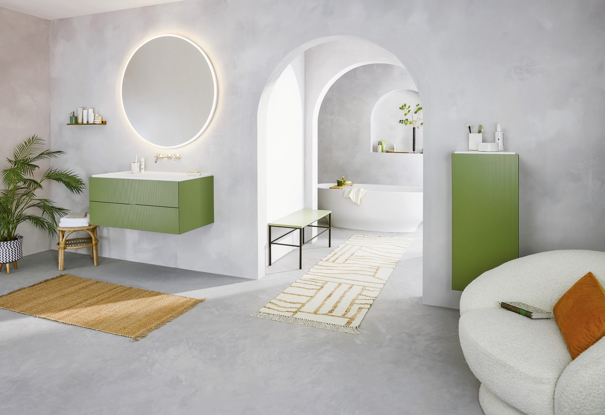 Die Frage nach den Bedürfnissen im Badezimmer hat das Design-Duo bei der Entwicklung von ‹Alterna alani› geleitet. Aus dieser Fragestellung sind zum einen die beruhigenden gestalterischen Elemente wie die gerillte Front aus Echtholzfurnier oder Farblack entstanden. Ausserdem gelingt es dank eleganter Eckverbindungen, den Waschtisch in das Möbel einzubetten. Funktionale Details wie beispielsweise eine passende Abtropfschale als Einlage und ‹Tip-on›-Öffnung oder ‹Soft-close› bei Schubladen und Türen komplettieren das Design. Die geriffelte Front spielt dabei eine wichtige Rolle: Sie sorgt durch ihr spannendes Licht-und-Schatten-Spiel für einen wohnlichen Charakter. Zurückhaltender wirkt die Ausführung mit den flachen Frontflächen. Mit der Wahl von natürlichen Farben und Materialien bekräftigen Steffensen & Würtz ihre Vision und schaffen ein warm und wohnlich wirkendes Badmöbel. Für dieses harmonische Raumgefühl sorgen auch die zum Möbel passende Sitzbank und die Hoch- und Seitenschränke. Mit durchdachten Details wie den gerillten Fronten oder sanft schliessenden Schubladen bietet ‹Alterna alani› nicht nur optische, sondern auch haptische Reize.