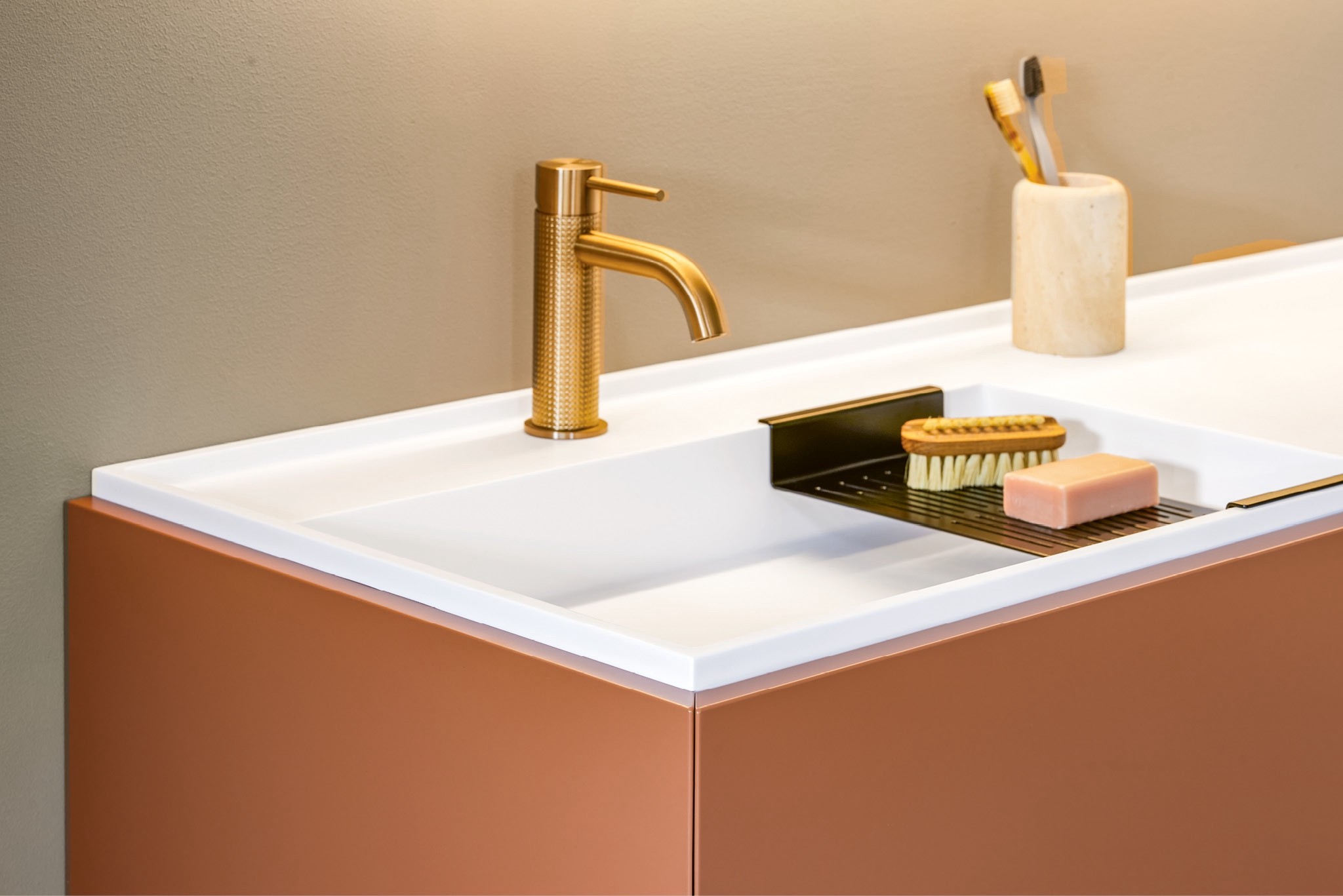 Auch den Waschtisch schliesslich gibt es in zahlreichen Ausführungen mit symmetrisch oder asymmetrisch angeordneten Abstellflächen. Aus pflegeleichtem Corian gefertigt, erleichtert er den Badalltag. So funktioniert ‹Alterna alani› in verschiedenen Grössen und bietet auch für das meist kleinere Gästebad eine überraschende Lösung – auch da mit Spa-Gefühl.