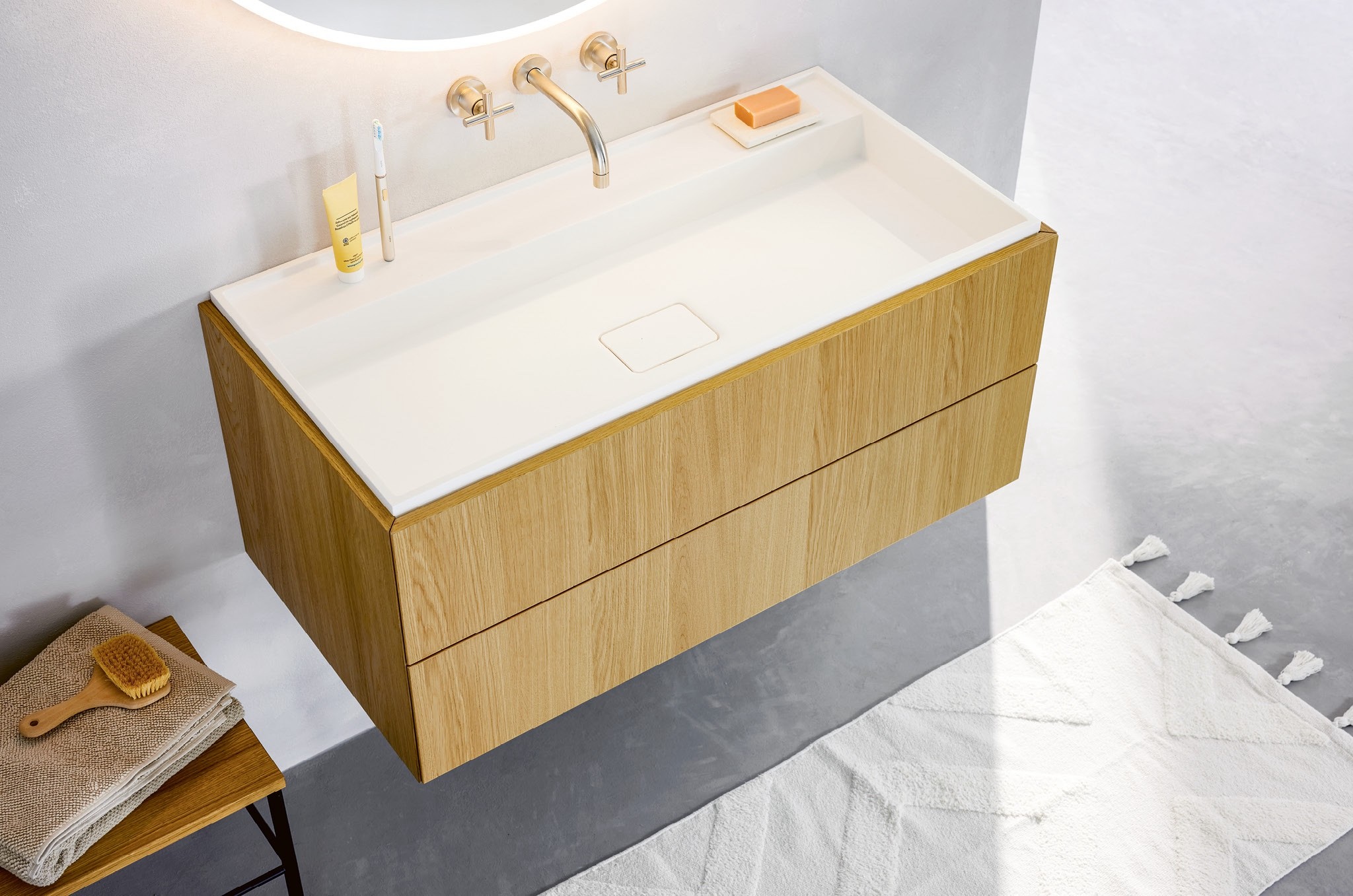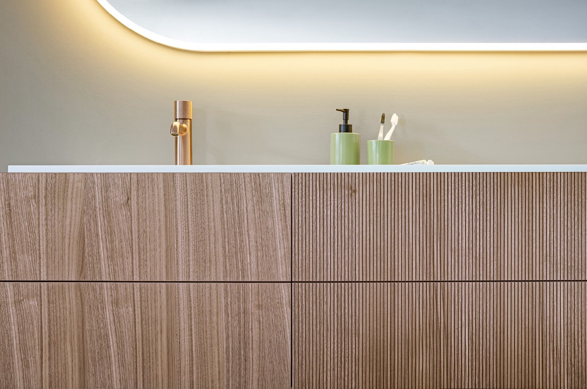 Für Architektinnen und Planer ist die Badmöbellinie besonders spannend, da sie eine hohe Flexibilität und Anpassungsfähigkeit bietet. Es gibt die Möglichkeit, zwischen verschiedenen Oberflächen, Farben und Montagemethoden – etwa die wandhängende Version oder die Variante mit Füssen – zu wählen. Nebst dem Echtholzfurnier gibt es die Möbel in diversen matten Lackfarben oder in supermatter Oberfläche – wahlweise mit gerillter oder flacher Front. Diese Flexibilität erlaubt es, massgeschneiderte Lösungen für unterschiedlichste Projekte zu entwickeln.