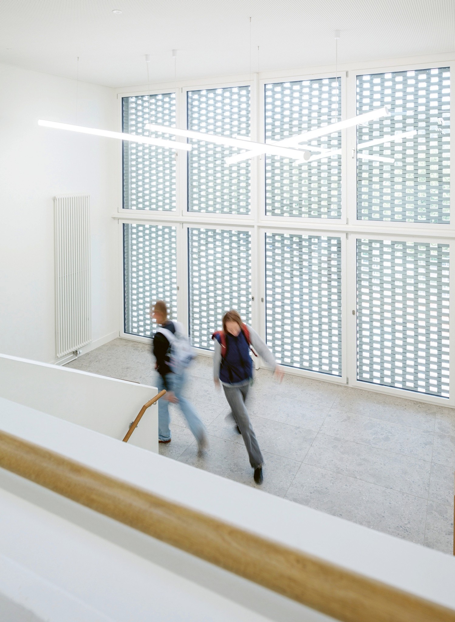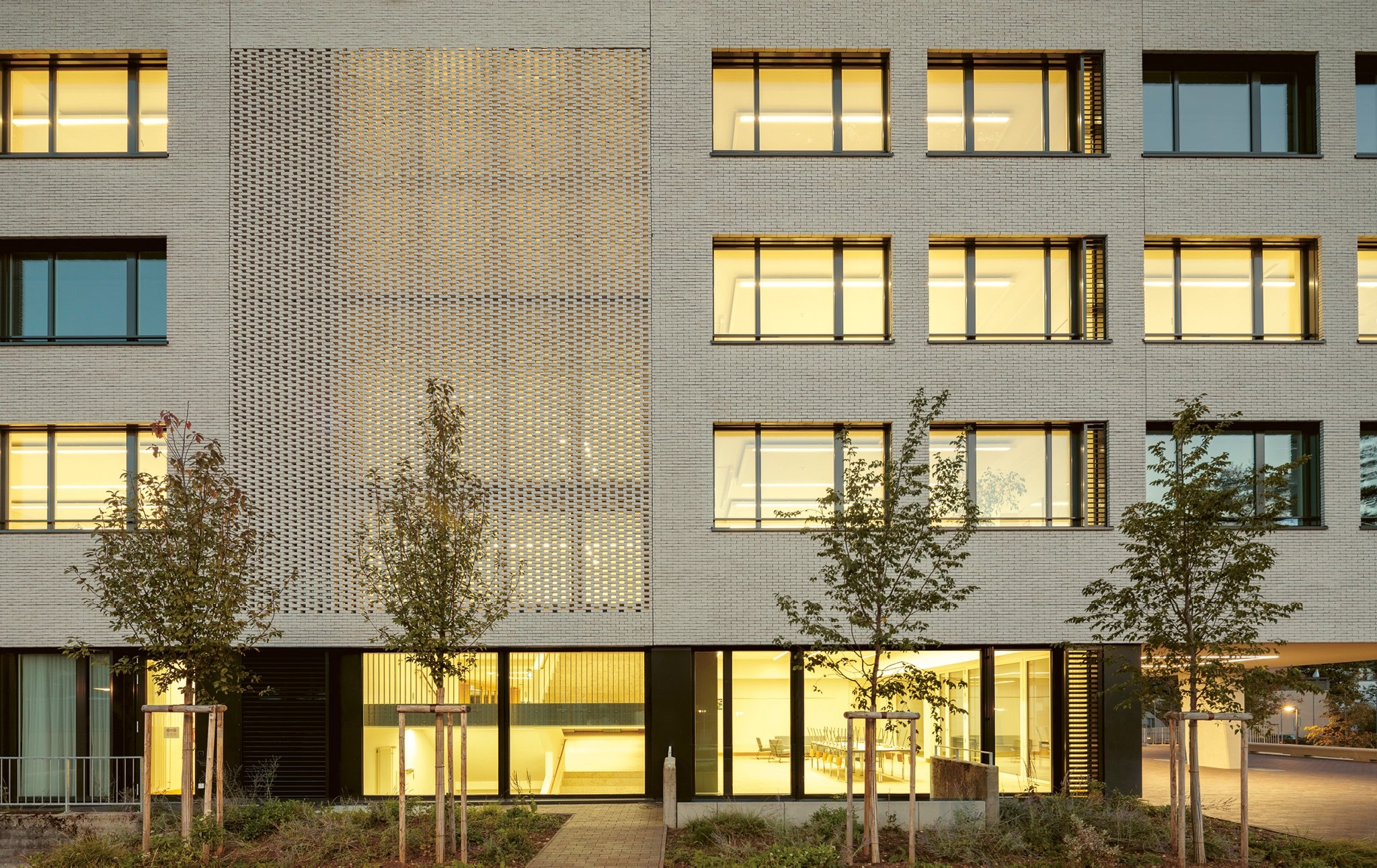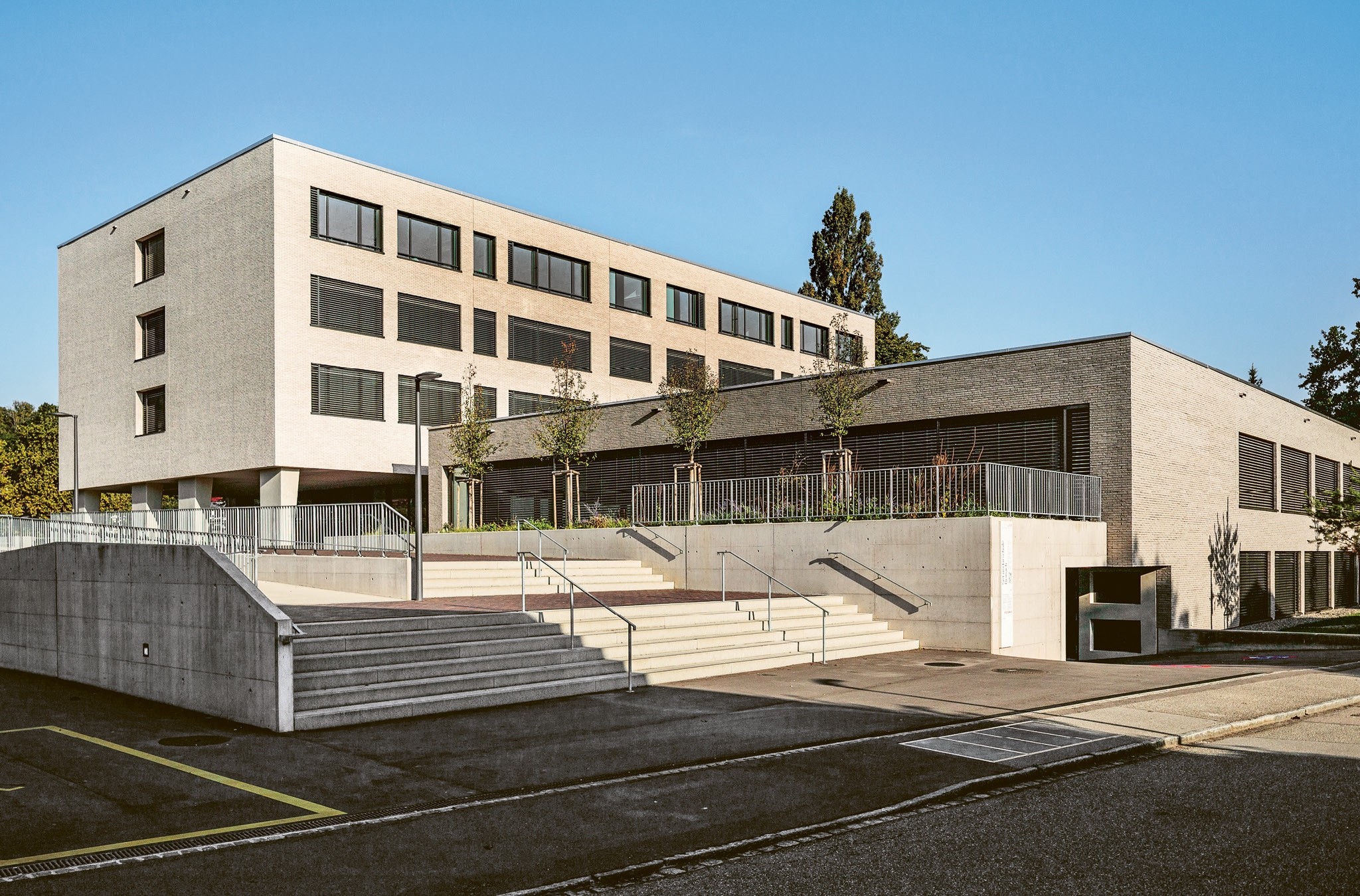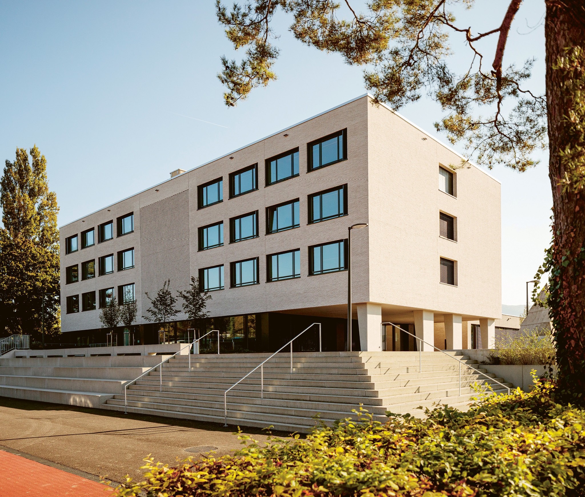 Zum Einsatz kamen zwei Produkte von Vandersanden: Der helle Verblender ‹Perla› basiert auf einem weissbrennenden Ton aus dem deutschen Westerwald. Eine zusätzliche weisse Besandung verleiht ihm seinen strahlenden Farbton. Der graue Verblender ‹Quartis› kombiniert denselben Ton mit regionalem Löss. Durch die Zugabe grauer Sande auf der Oberfläche entsteht der gewünschte Farbton. Die charakteristische Maserung der Sichtfläche ergibt sich aus dem Zusammenspiel von Besandung und dem Werfen des Tonballens in die Form. Jeder Stein ist ein Unikat und verleiht der Fassade einen lebendigen, natürlichen Charakter. Integriert in die Riemchenfassade, wurden im Treppenhaus der Schule auch Vollsteine im Lochverband verwendet, was in diesem Bereich zusätzliches Licht ins Gebäude bringt. Das sanierte Ensemble wurde vom Hochbauamt des Kantons Basel-Landschaft mit dem Standard Nachhaltiges Bauen Schweiz (SNBS) ausgezeichnet. Auf dem begrünten Dach steht eine Photovoltaikanlage, und im gesamten Bau hat man auf natürliche Materialien gesetzt. «Unsere Kundschaft vertraut auf unsere ökologischen Produkte», erklärt Reto Aregger und verweist damit auf eine weitere Qualität des Baustoffs Ton.