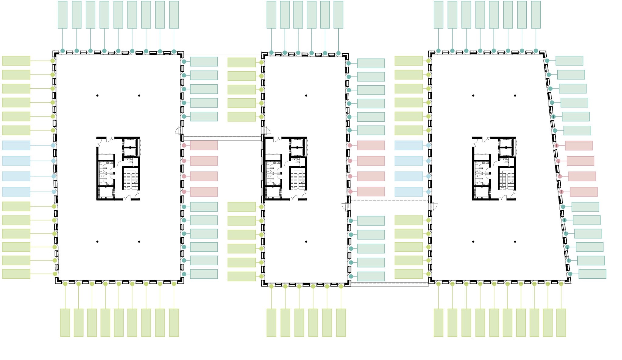 Auf den 15 000 Quadratmetern Nutzfläche des jüngsten Gebäudes sollen Büros und Labors einziehen. Der Plan zum Neubau basiert auf dem Prinzip ‹22•26›, entwickelt von der Baumschlager-Eberle-Gruppe: In den drei Bürogeschossen gibt es keine Heizung, keine Kühlung, keine Lüftung – und dennoch sollen die Temperaturen bei stabilen 22 bis 26 Grad Celsius zu liegen kommen. Dass dieses Konzept funktioniert, haben die Architekten bereits mehrfach bewiesen, wenn auch nicht bei einem so grossen Haus. Der Neubau in Schlieren wird seine Wärme einzig von Menschen, technischen Geräten und Lichtquellen beziehen. Aussergewöhnlich dicke Aussenwände und Decken dienen als Dämm- und Speichermasse, die Fassaden- und Fensterflächen sind perfekt aufeinander abgestimmt und an den Standort angepasst. Eine besondere Rolle spielen die Fenster: Sie gewährleisten nicht nur Wärme- und Schallschutz, sondern regulieren auch den Luftaustausch. Jedes enthält einen sensorisch gesteuerten Lüftungsflügel. Ist es zu heiss oder ist der CO2-Anteil zu hoch, öffnen sie sich automatisch und regulieren so das Raumklima.