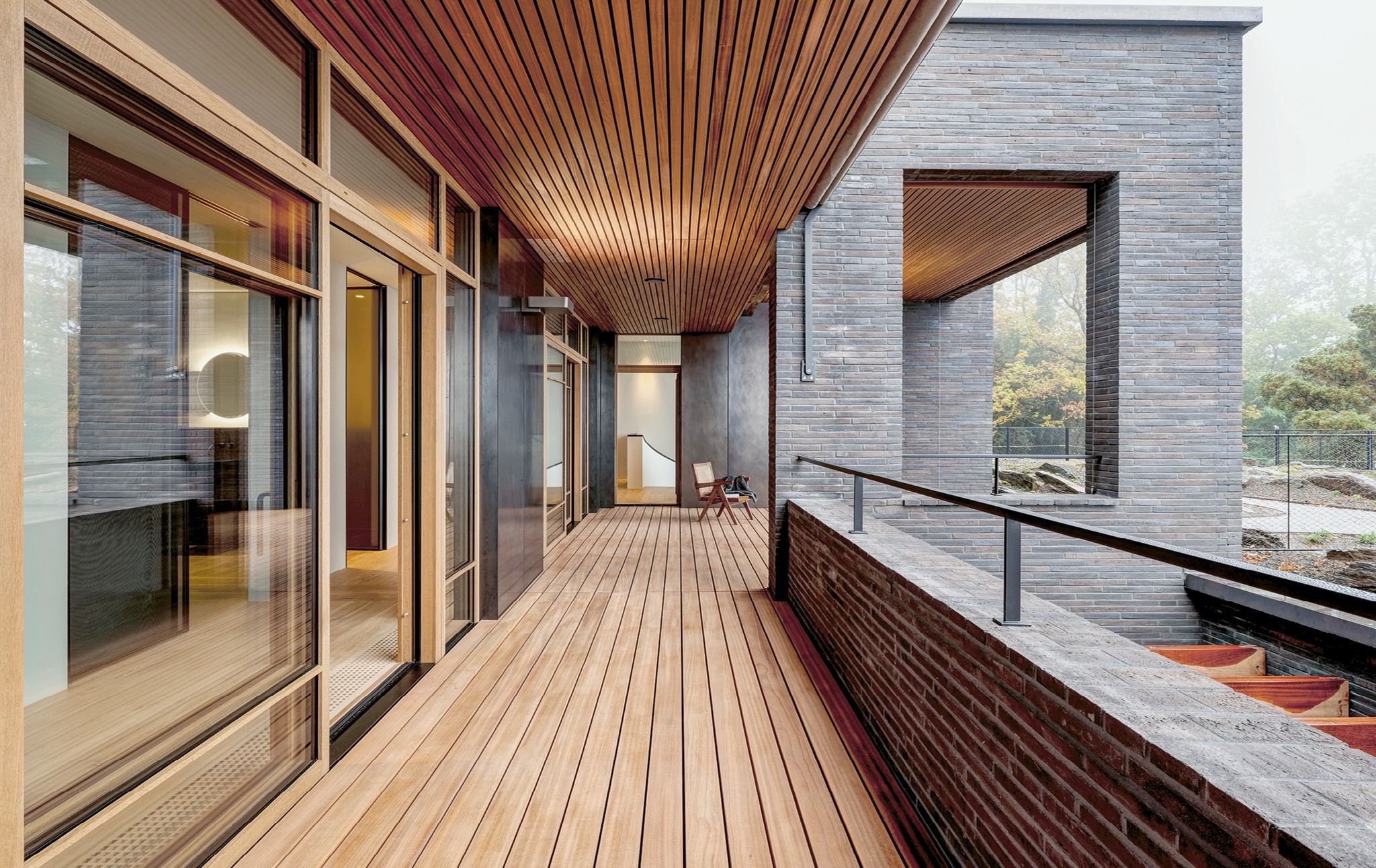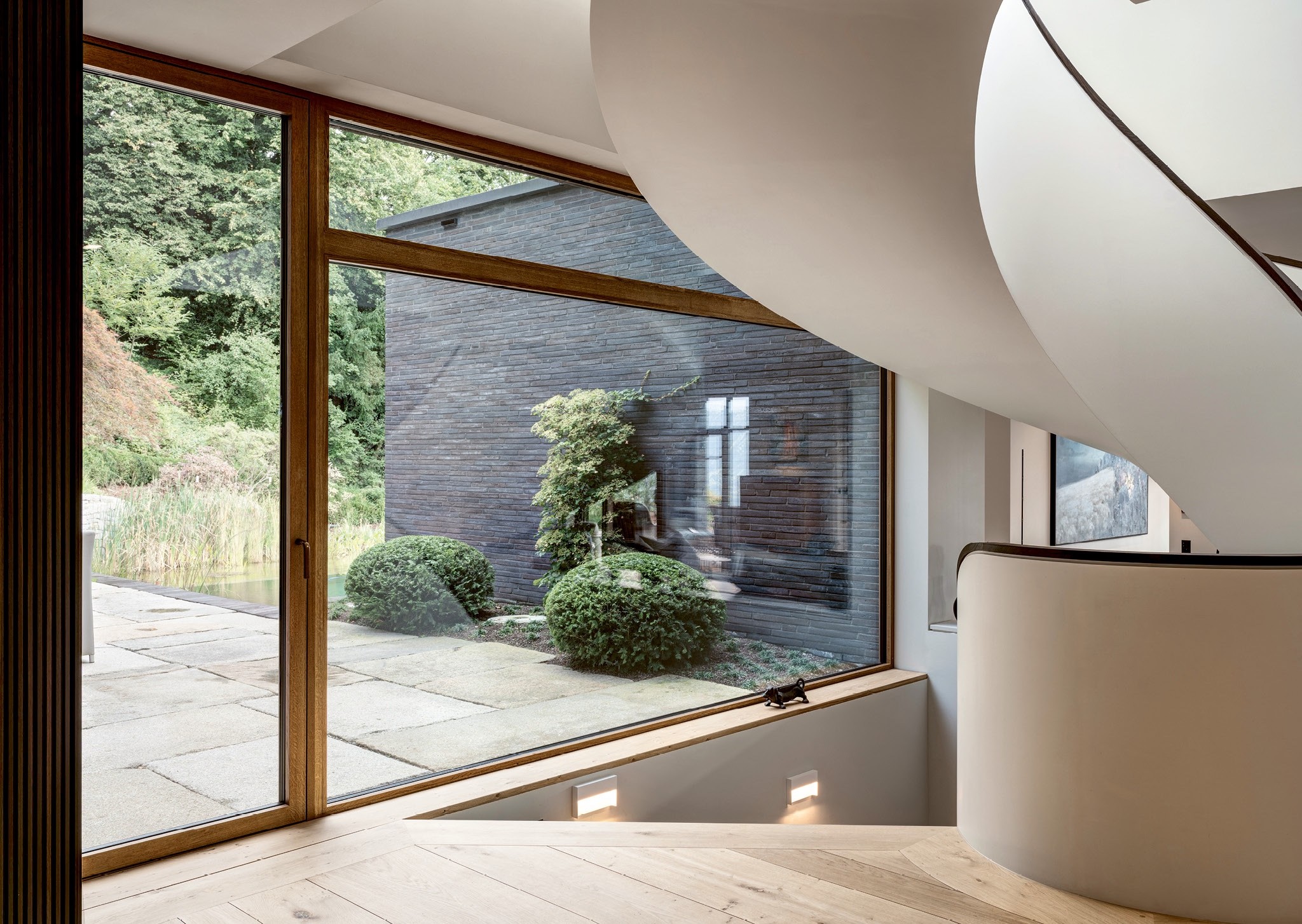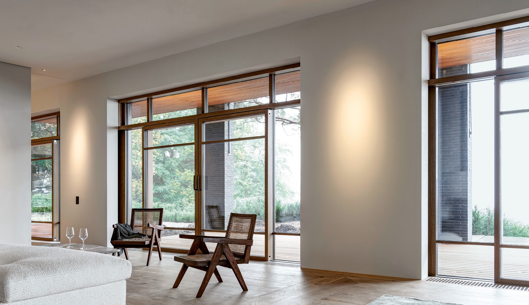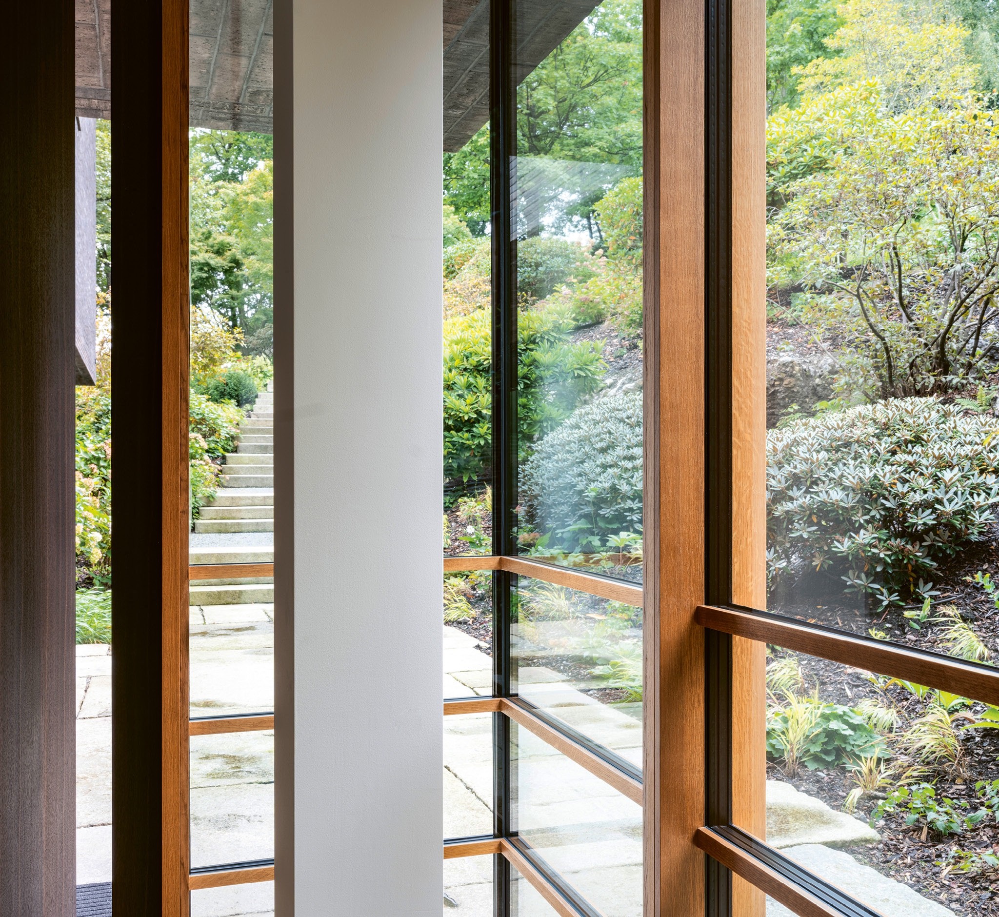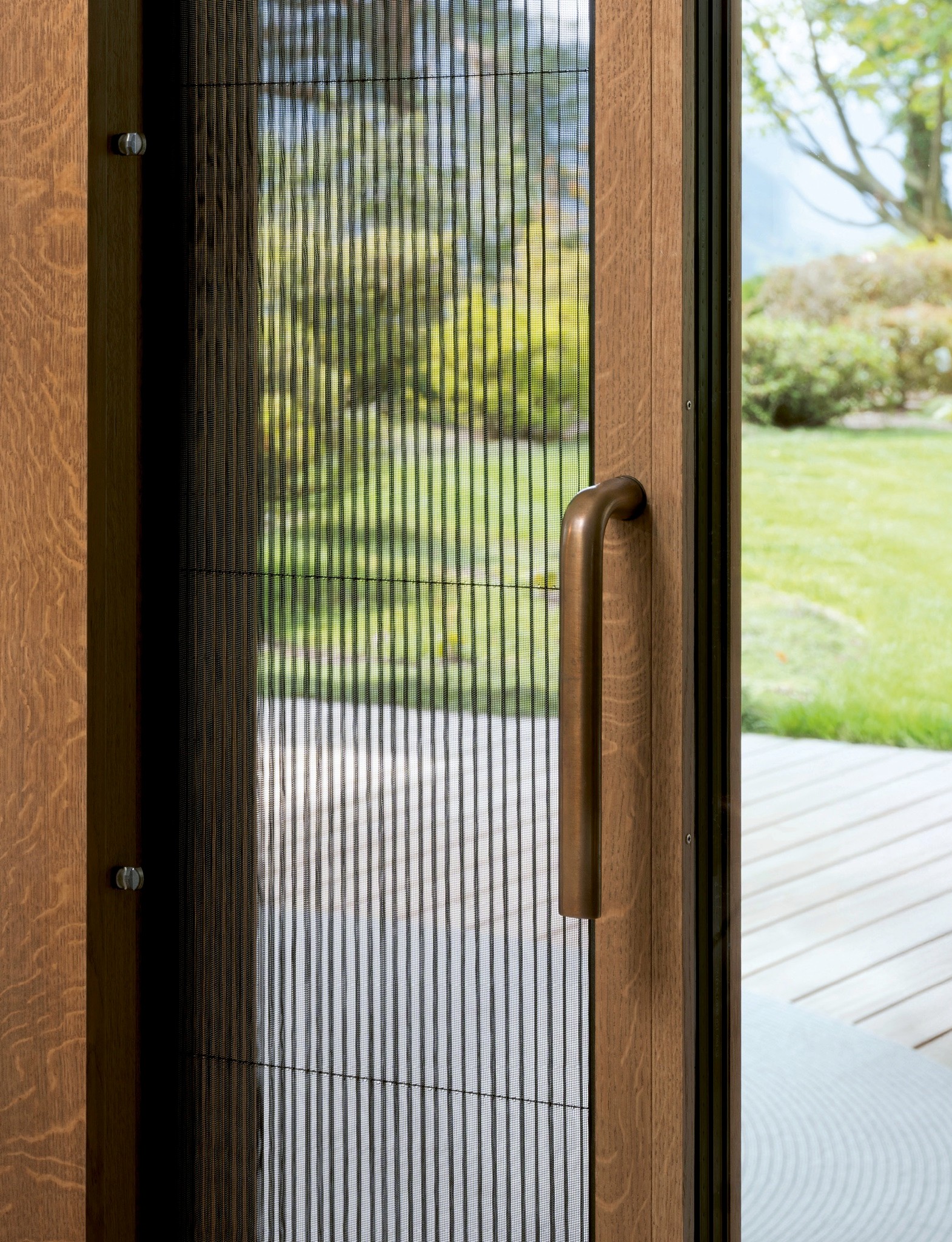 Die talseitige Arkade verstärkt die horizontale Wirkung des Gebäudes. Die Fenster und Hebeschiebetüren aus naturbelassener, lasierter Eiche strukturieren die Ausblicke in die Landschaft und in den Garten bewusst. Je nach Raum und Ausblick sind die Fenster unterschiedlich gestaltet. Entsprechend ist jedes Fenster Massarbeit. «Wir konnten viele einmalige Details einbauen, nichts ist ab Stange», sagt Matthias Huber, COO der zuständigen Firma Huber Fenster. Die schlichten Fenster- und Türrahmen lassen kaum vermuten, dass sich darin viel Technik verbirgt. Matthias Huber erklärt: «Die Einfachheit der Fenster täuscht über die Komplexität hinweg: Wir haben alles technisch Notwendige in den Rahmen integriert.» Die Rahmen nehmen nicht nur das dreifache Isolierglas auf, sondern auch die Beschläge, die vollständig verdeckt sind. In allen Fenstern sind Alarmkontakte und Einbruchschutz eingelassen, und in den Badezimmerfenstern wurden die Öffnungsmotoren verdeckt verbaut. In die Rahmen der Schiebetüren wiederum sind Plissees eingearbeitet, die bei Bedarf als Insektenschutz ausziehbar sind.