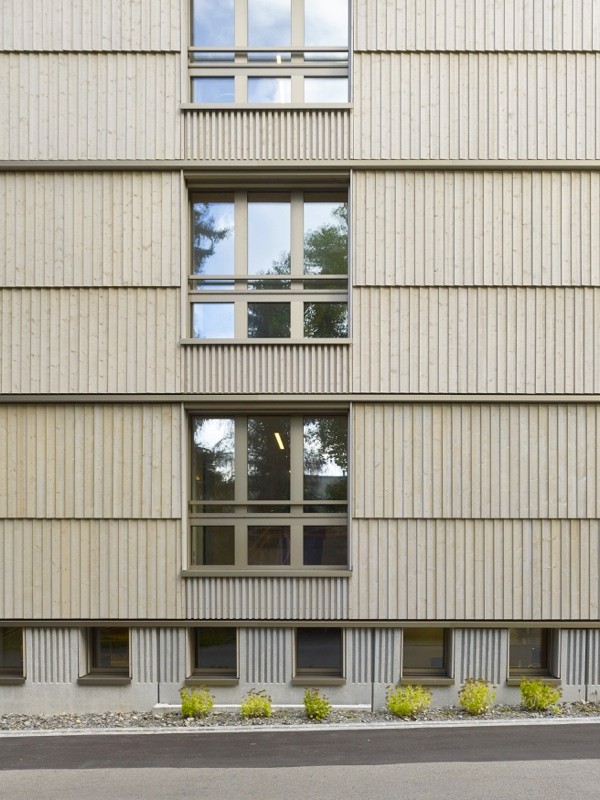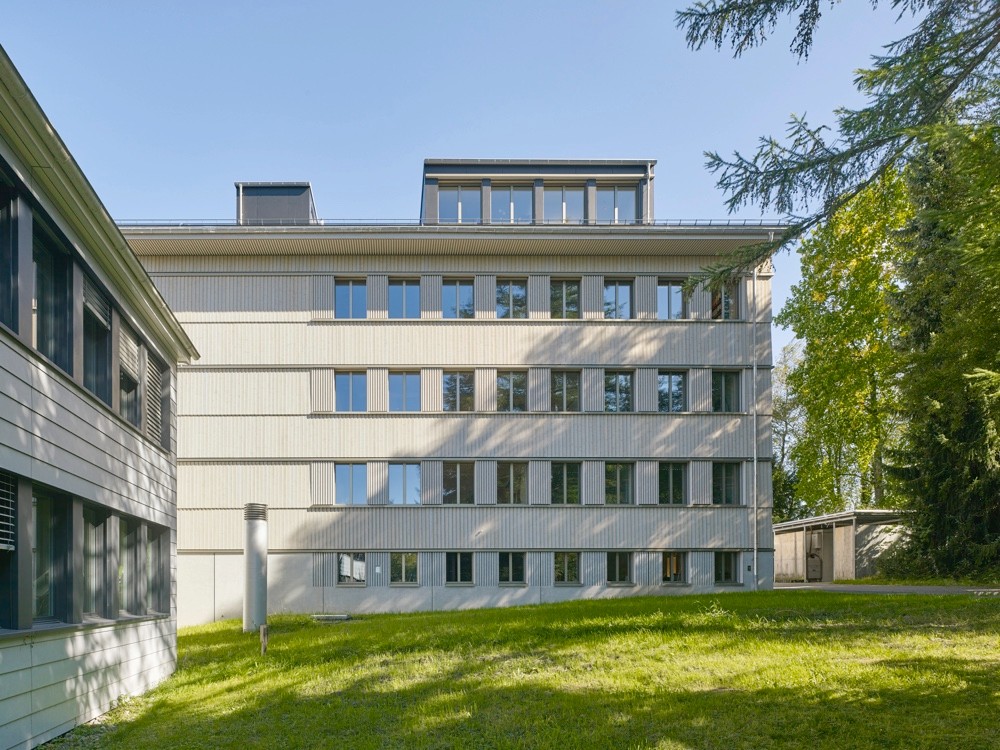 Das Areal der Forschungsanstalt WSL in Birmensdorf liegt bald nach der Stadtgrenze von Zürich hinter dem Uetliberg. Über die Jahrzehnte ist das Ensemble, das rund ein Dutzend Bauten umfasst, zu einem heterogenen Konglomerat angewachsen. Der Rundgang gleicht einer Zeitreise durch die letzten 50 Jahre Baugeschichte: Betonvorfertigung aus den 60er-Jahren, Holzarchitektur mit Schrägdach aus den 80er-Jahren, Stahl- und Glas-Kisten der 90er-Jahre. Um Ruhe in diese Stilvielfalt zu bringen, entwarf Schwarz eine reduzierte Holzfassade, mit der er die beiden Bürohäuser von 1957 einpackte. Die neue Hülle bindet die Gebäude optisch zusammen, ohne die Struktur zu verändern. Die Holzfassade ruht auf einem Sockel aus Beton, der in einem ähnlichen Grauton wie das Holz und die Rollläden gehalten ist. Die vorvergrauten Bretter werden gleichmässig altern und so die Homogenität über die Zeit retten. Mit «unaufgeregt», «ruhig», «langlebig» beschreibt Schwarz die Architektur.
