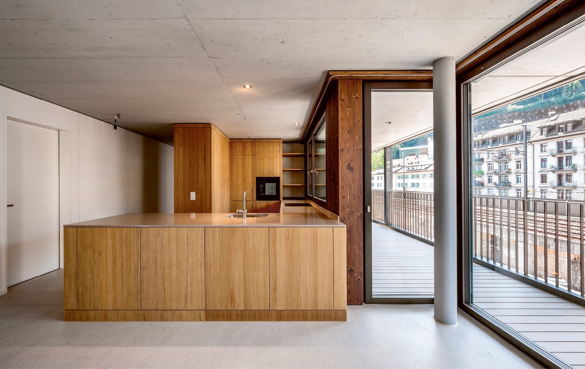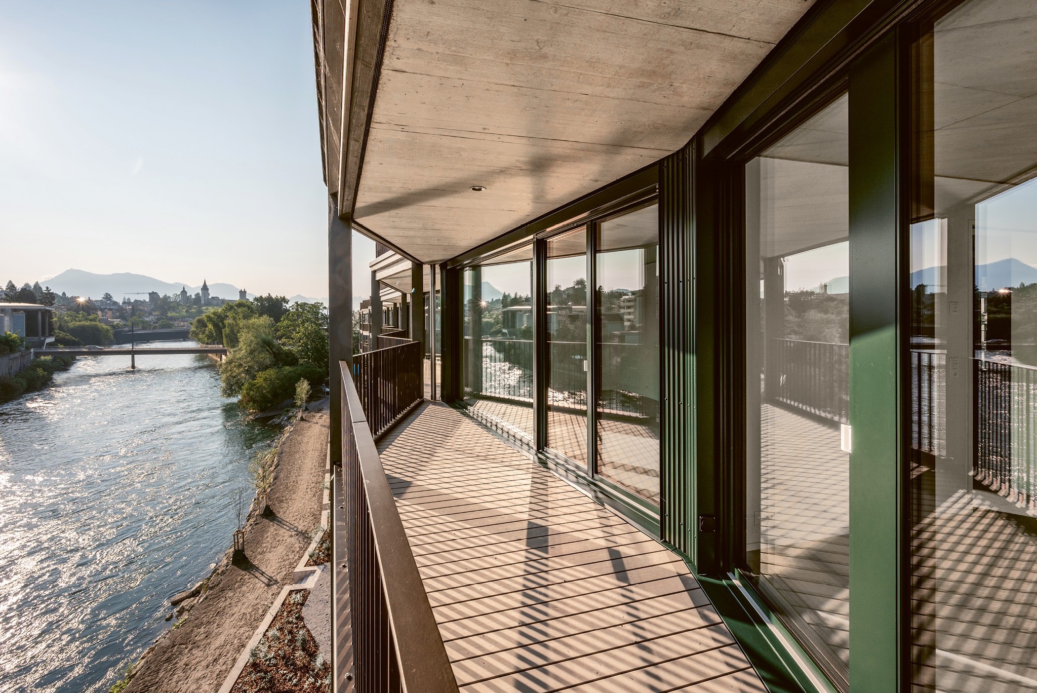 Die Überbauung Reussinsel III fügt sich gut zwischen Reuss und Bahngleisen ein. Die moderne Fenstertechnik eröffnet der Bewohnerschaft den Blick auf Natur und Stadt, ohne dass sie etwas davon hört.