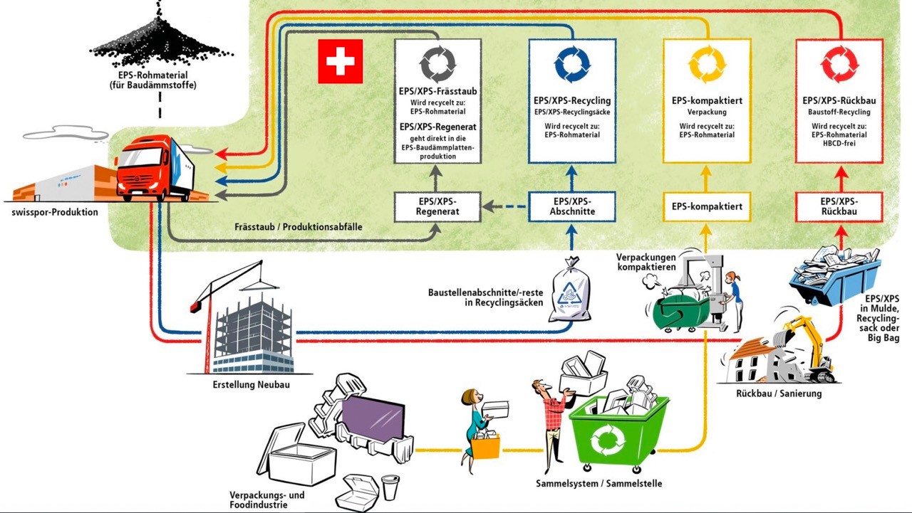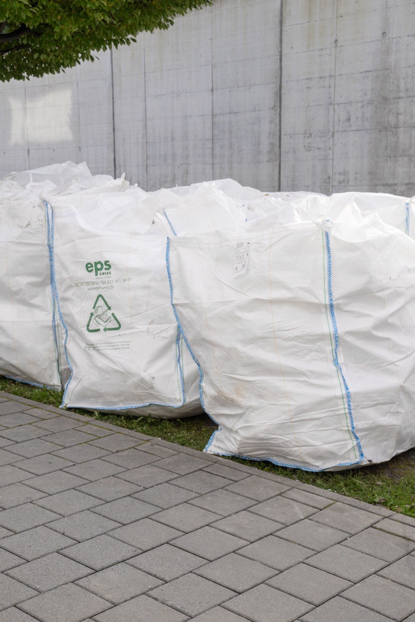 Bei der Sanierung einer Wohnüberbauung in Luzern wurde das Swisspor-Recyclingkonzept erstmals mit grossen Mengen getestet: 4000 Quadratmeter Fassadenmaterial fielen an. Inzwischen ist der Kreislauf «baureif». Abbruchunternehmungen und Bauunternehmer, können bei Swisspor Recycling-Säcke und sogenannte «Big Bags» beziehen und sie auf der Baustelle mit Dämmmaterial füllen. Das Geschäftsmodell: Der Swisspor-Recycling-Weg soll günstiger sein als die Gebühren der Kehrichtverbrennung und der Transport dorthin. Swisspor holt die Säcke ab und erhält hochwertige, lokale Sekundärrohstoffe.