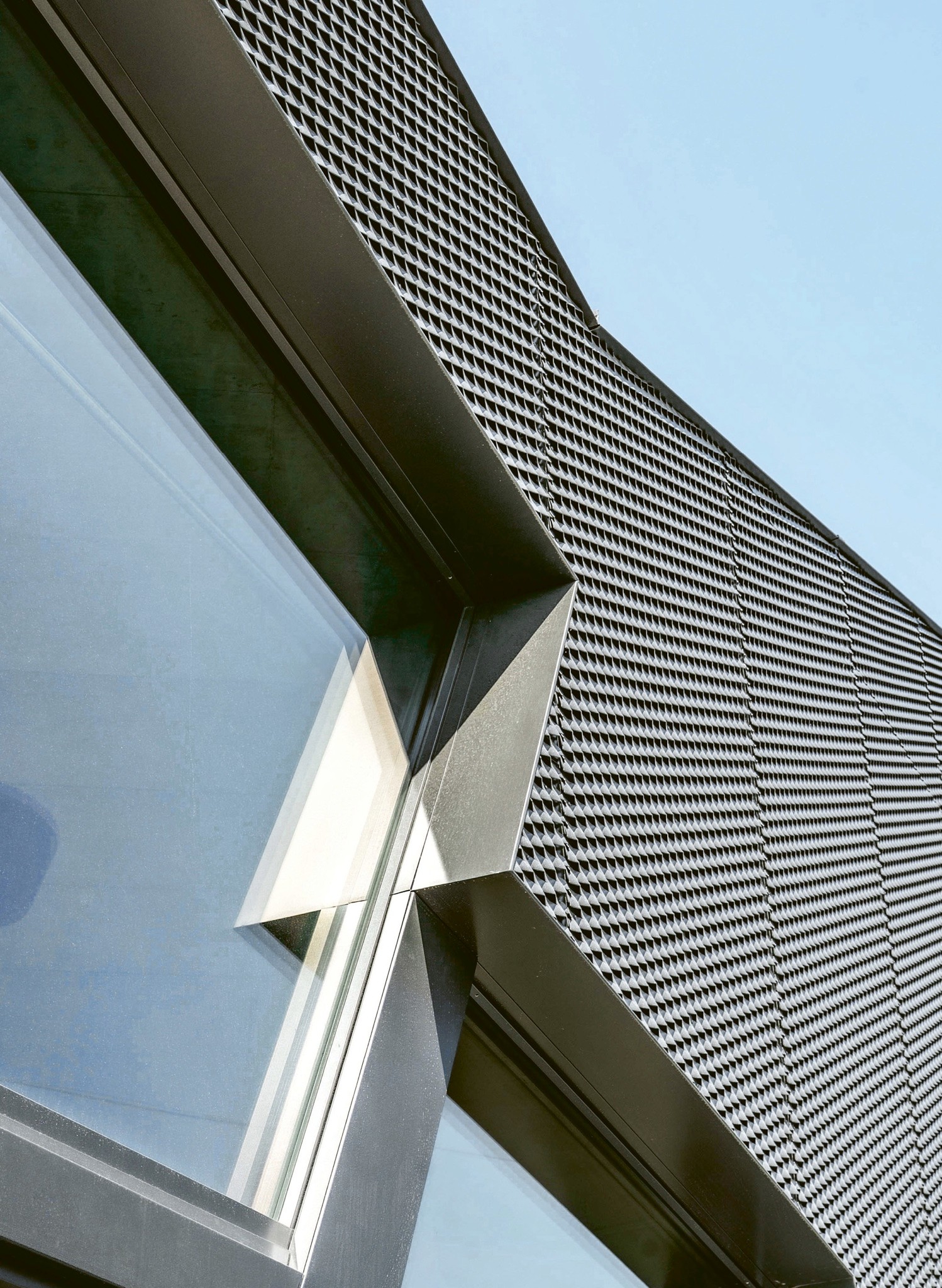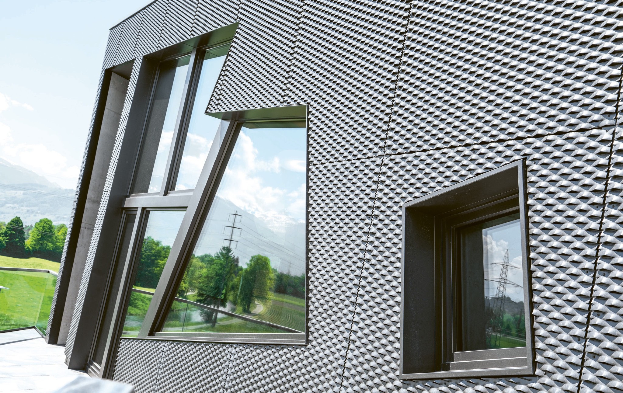 Gestalterisch gibt es zahllose Optionen. In Sennwald entschied man sich nicht für eine der rund 50 Dekorfolien, sondern – passend zur scharfkantigen Geometrie – für Aluminium-Vorsatzblenden in mattem Grau. Diese werden via Clip-Mechanismus dauerhaft befestigt und sind in sämtlichen RAL-Farben, eloxiert und pulverbeschichtet erhältlich. Innen fiel der Entscheid auf die lackveredelte Oberfläche Veka Spectral in mattem Schwarz. Die samtig wirkende Oberfläche ist staubabweisend und leicht zu reinigen, gehärtet und abriebfest.