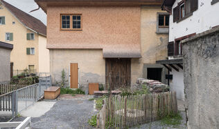 Verrucano im Holzgefieder  In Ennenda bei Glarus hat der Architekt Lando Rossmaier eine alte Mühle zum Wohnhaus umgebaut. Innen spielt Flumser Verrucano eine Hauptrolle.